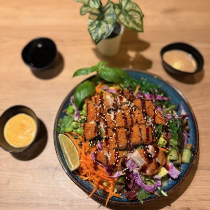 Tofu med ris eller nudler, mix salat, tang, gulerod, agurk, edamamebønner, rødkål, sesamfrø, chilimayo , gomasauce og teriyaki.