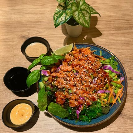 Laks med ris eller nudler, mix salat, tang, gulerod, agurk, edamamebønner, rødkål, sesamfrø, chilimayo , gomasauce og teriyaki.