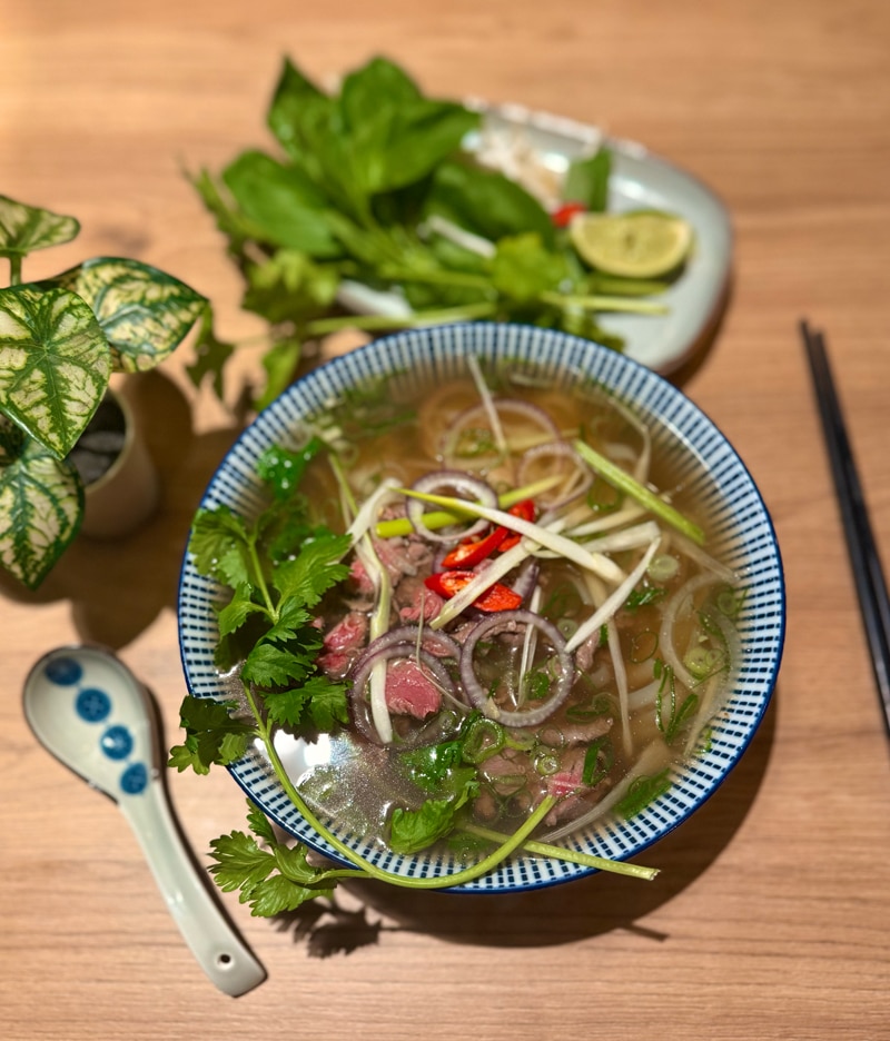 Oksekødssuppe,, oksekød, forårsløg , løg, koriander, basilikum,
